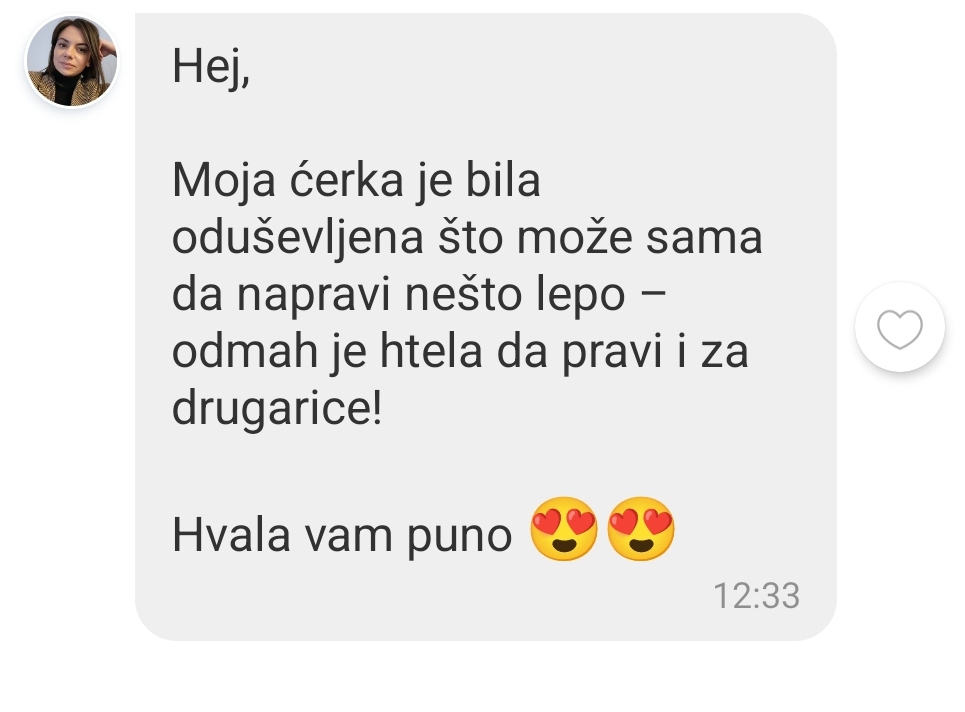 Ukoliko želite, možete od nas poručiti i set sa svim alatima i materijalima za rad, a možete se posebno zabaviti pri zajedničkoj kupovini u pozamanteriji.